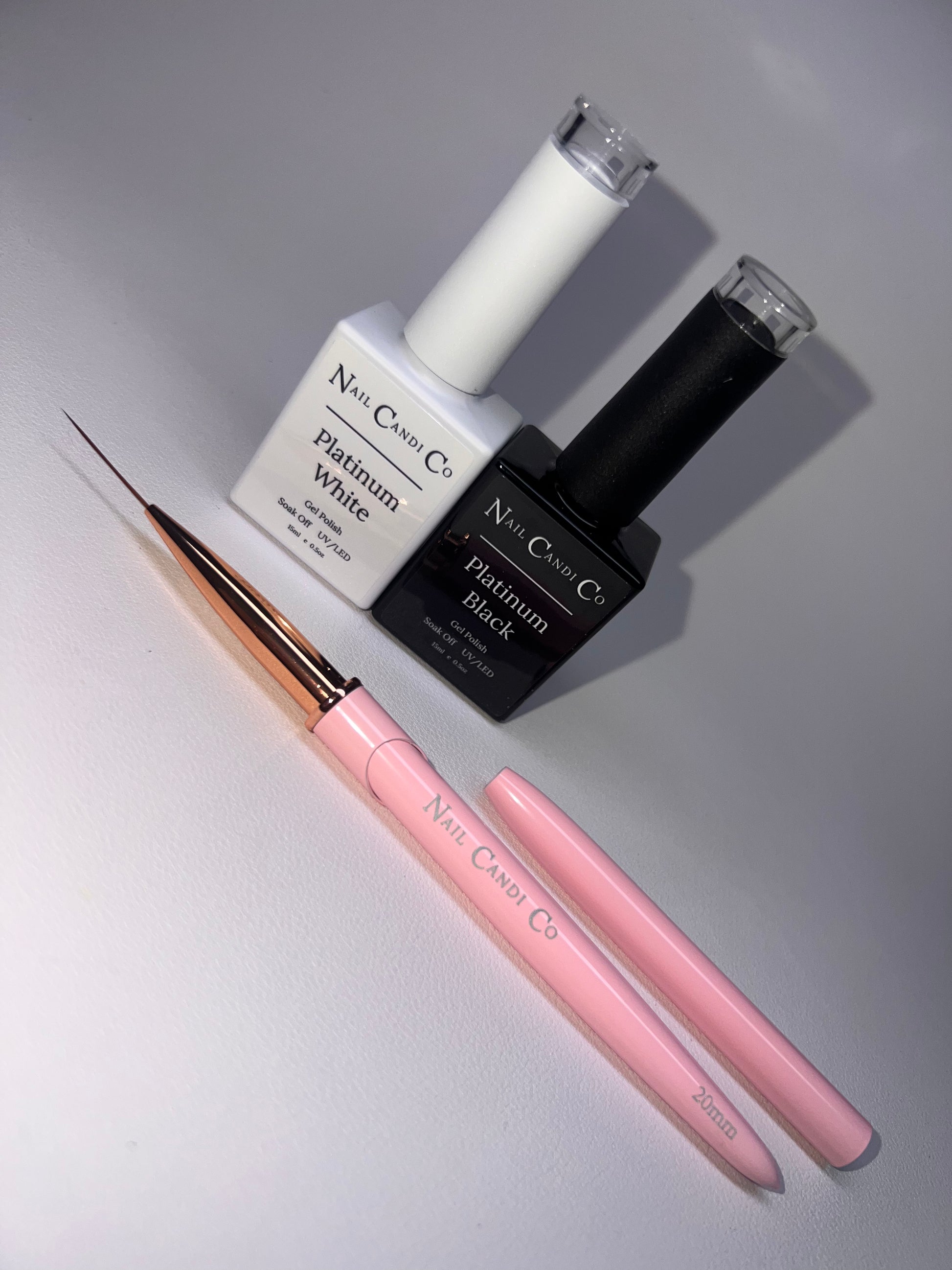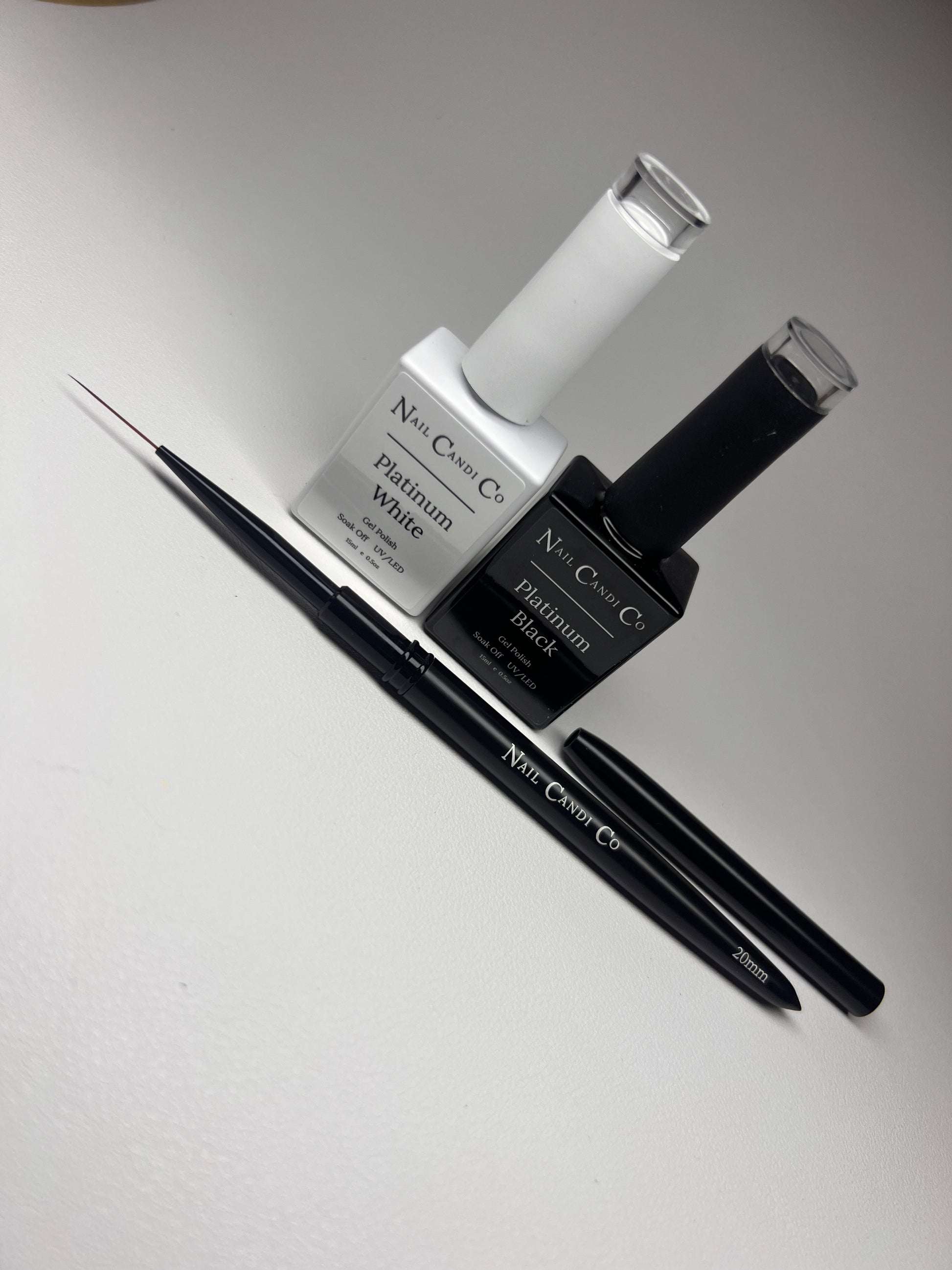 Bundle comes with our platinum black & white gel polish and 20mm liner brush